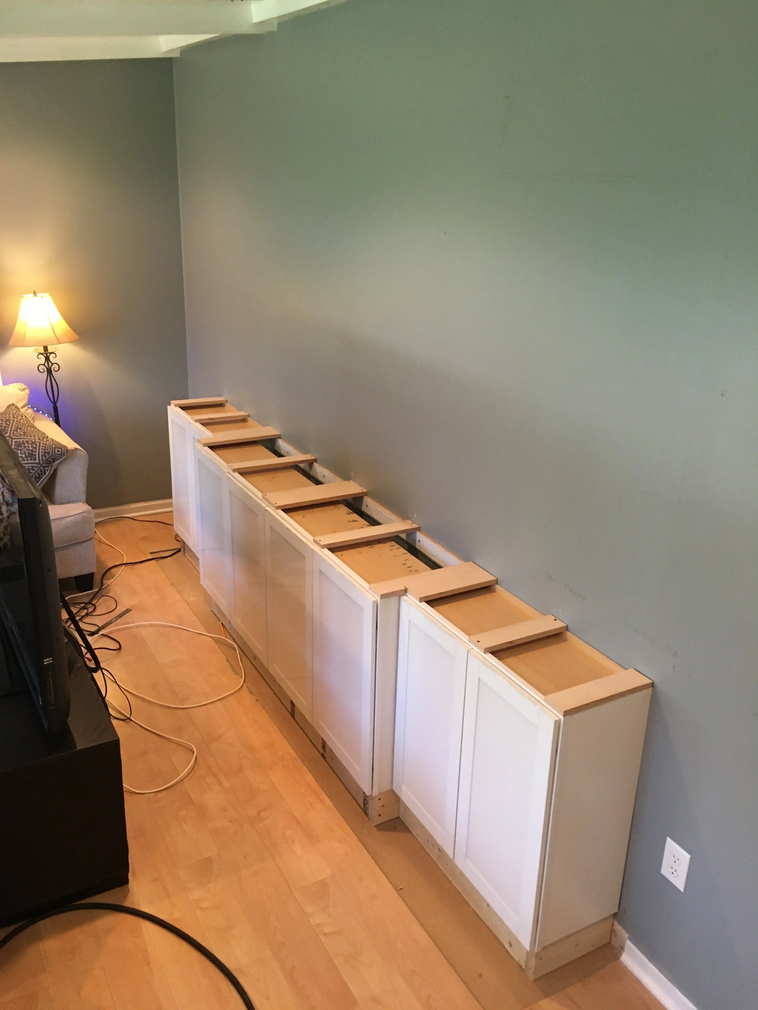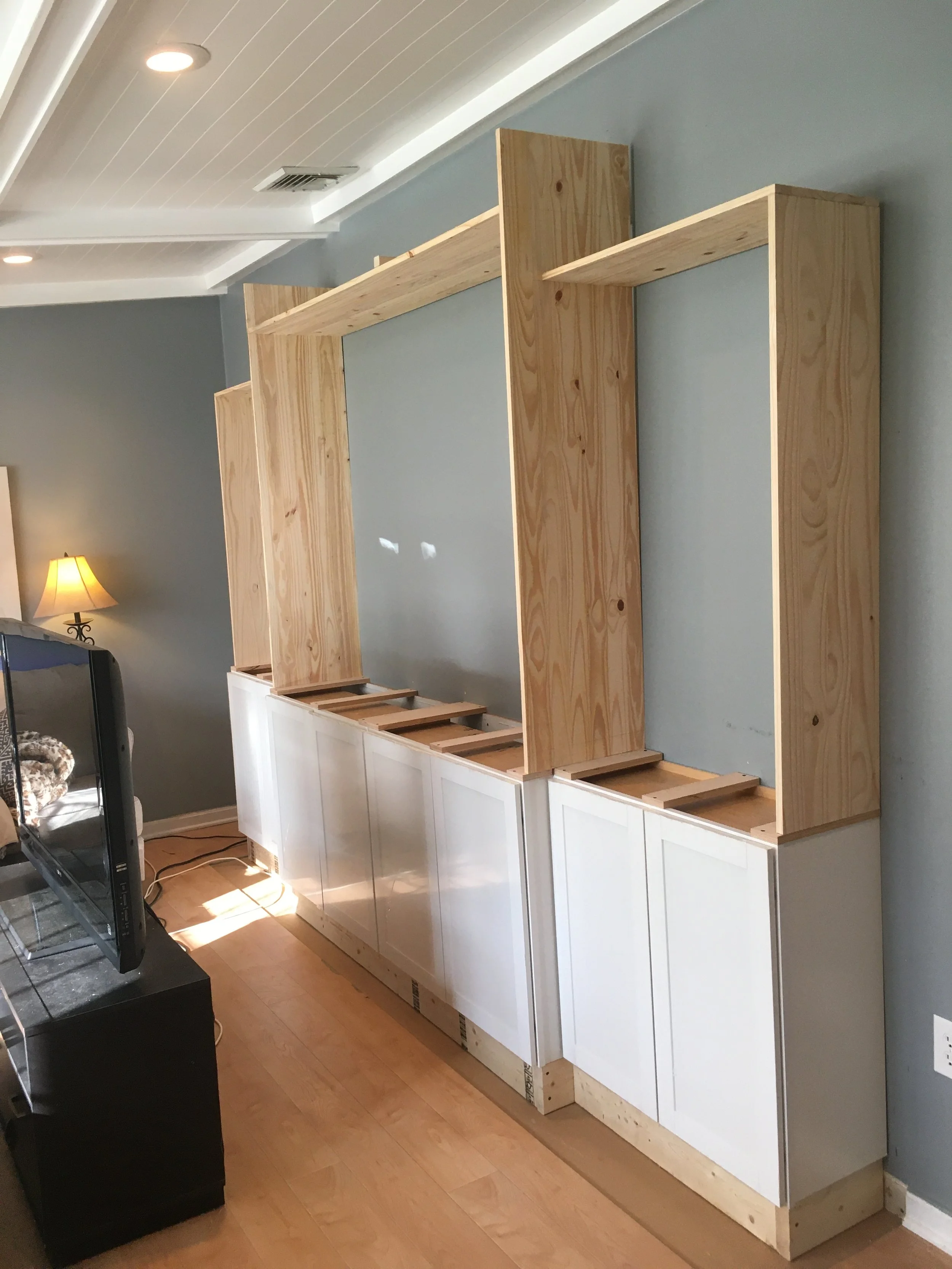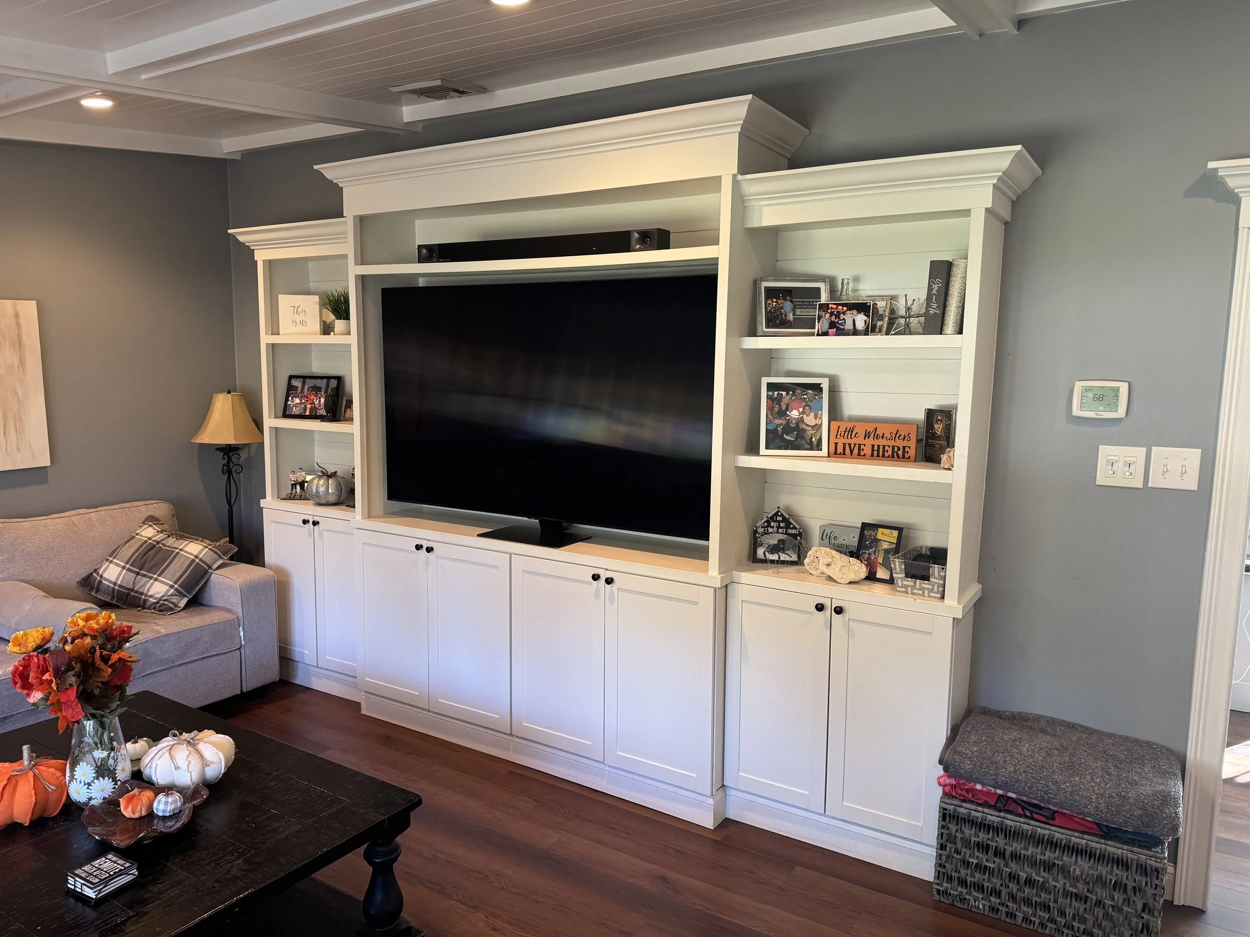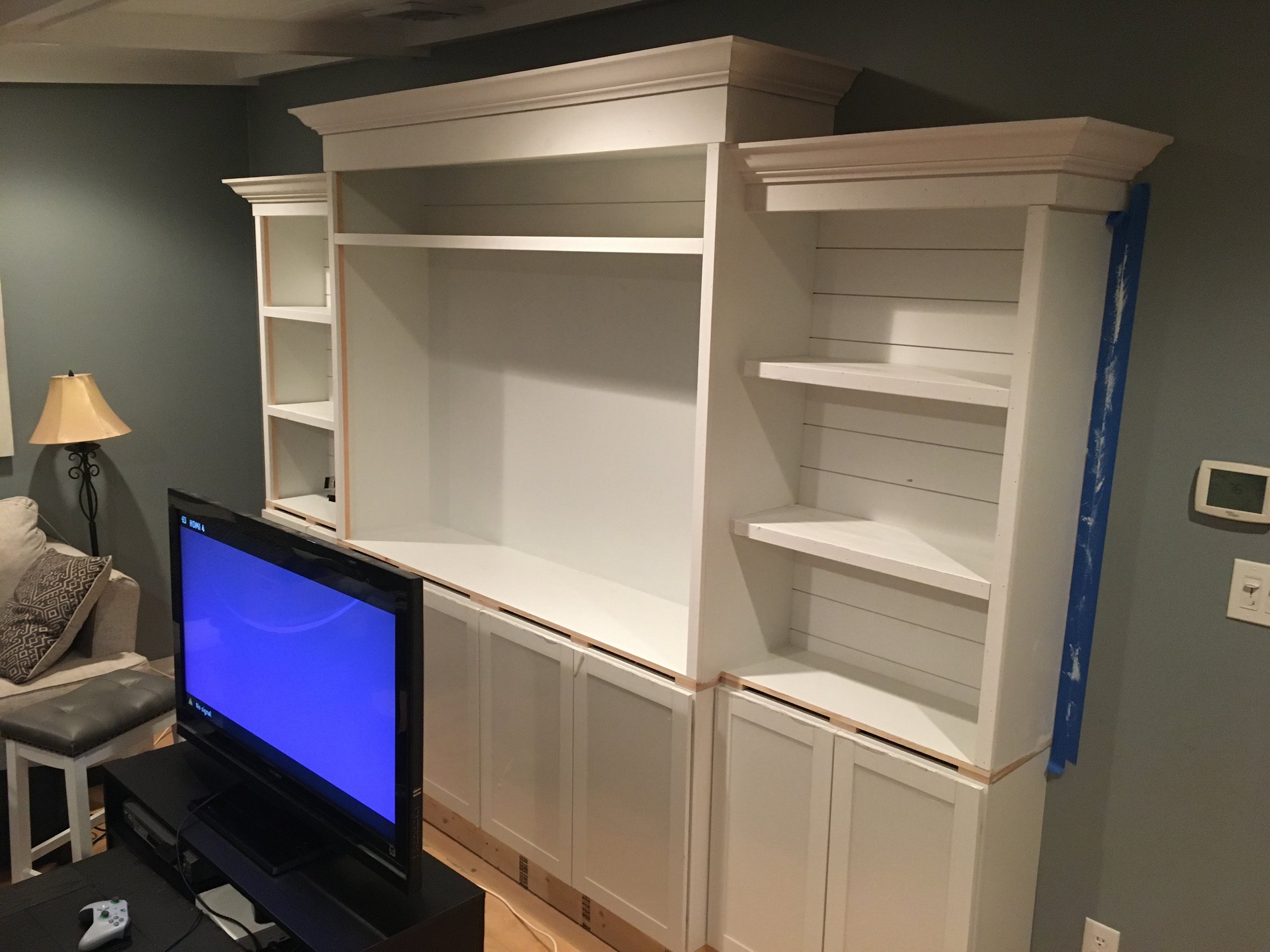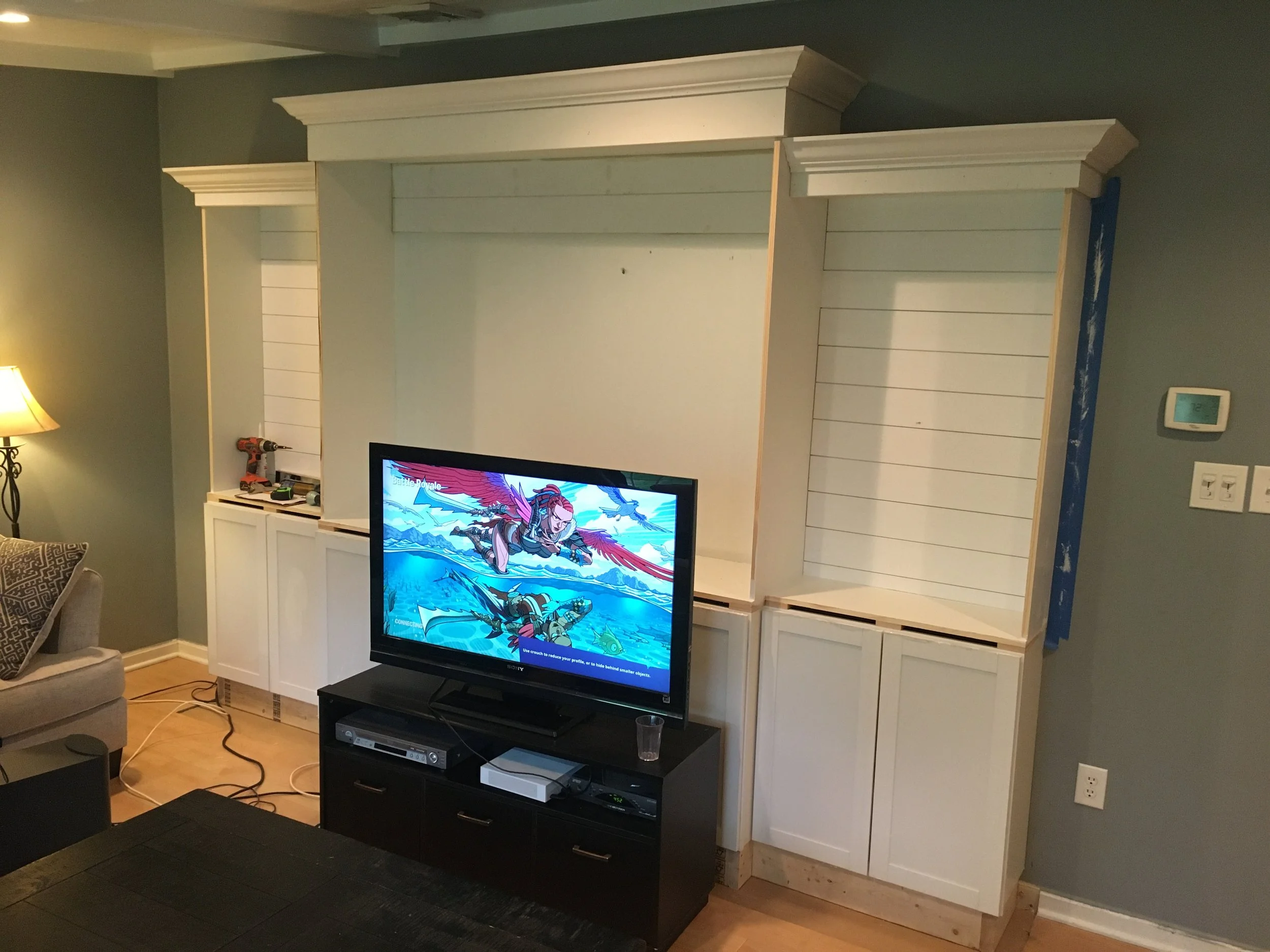 Finished the frame with crown molding accents, and installed shiplap as the bacground.
