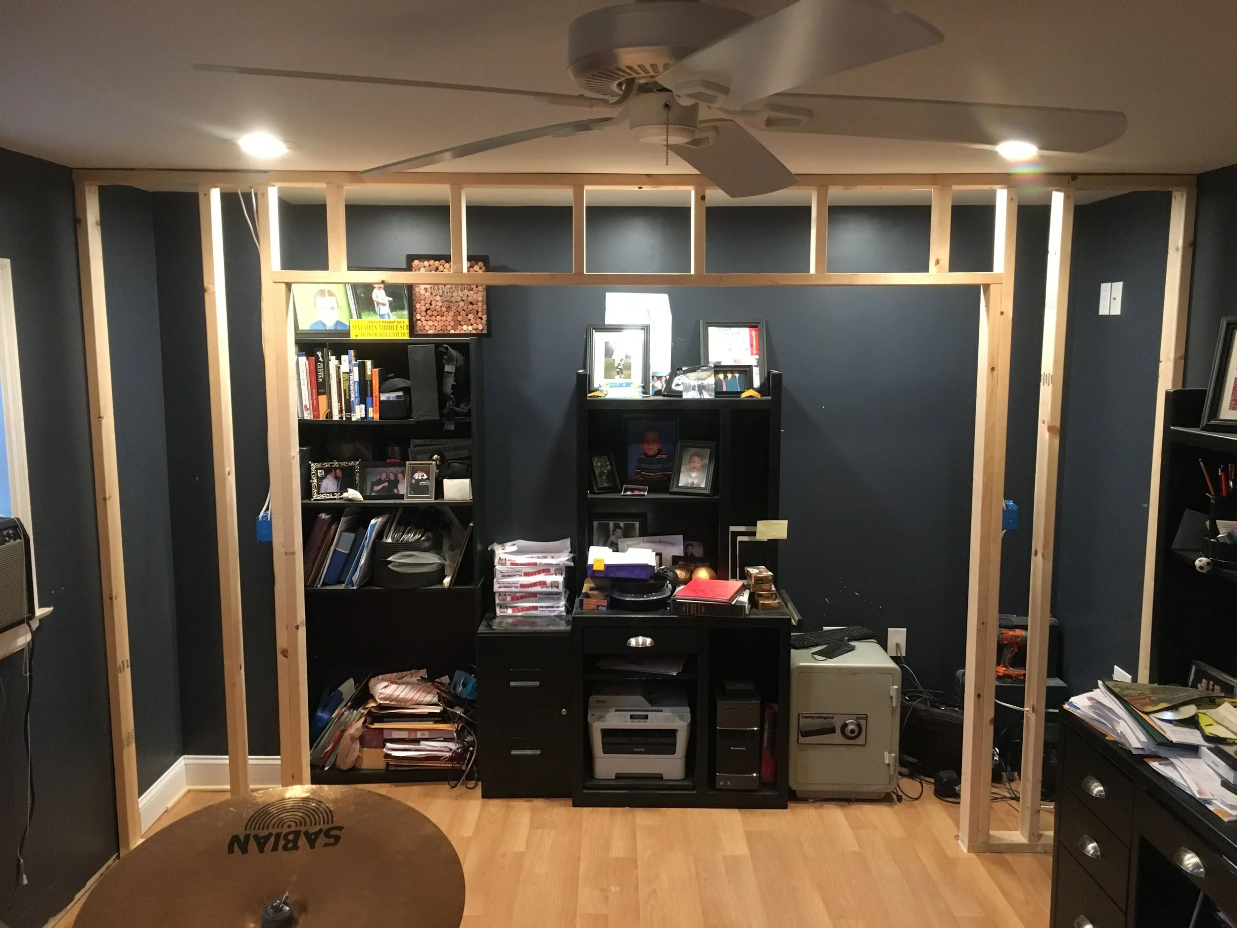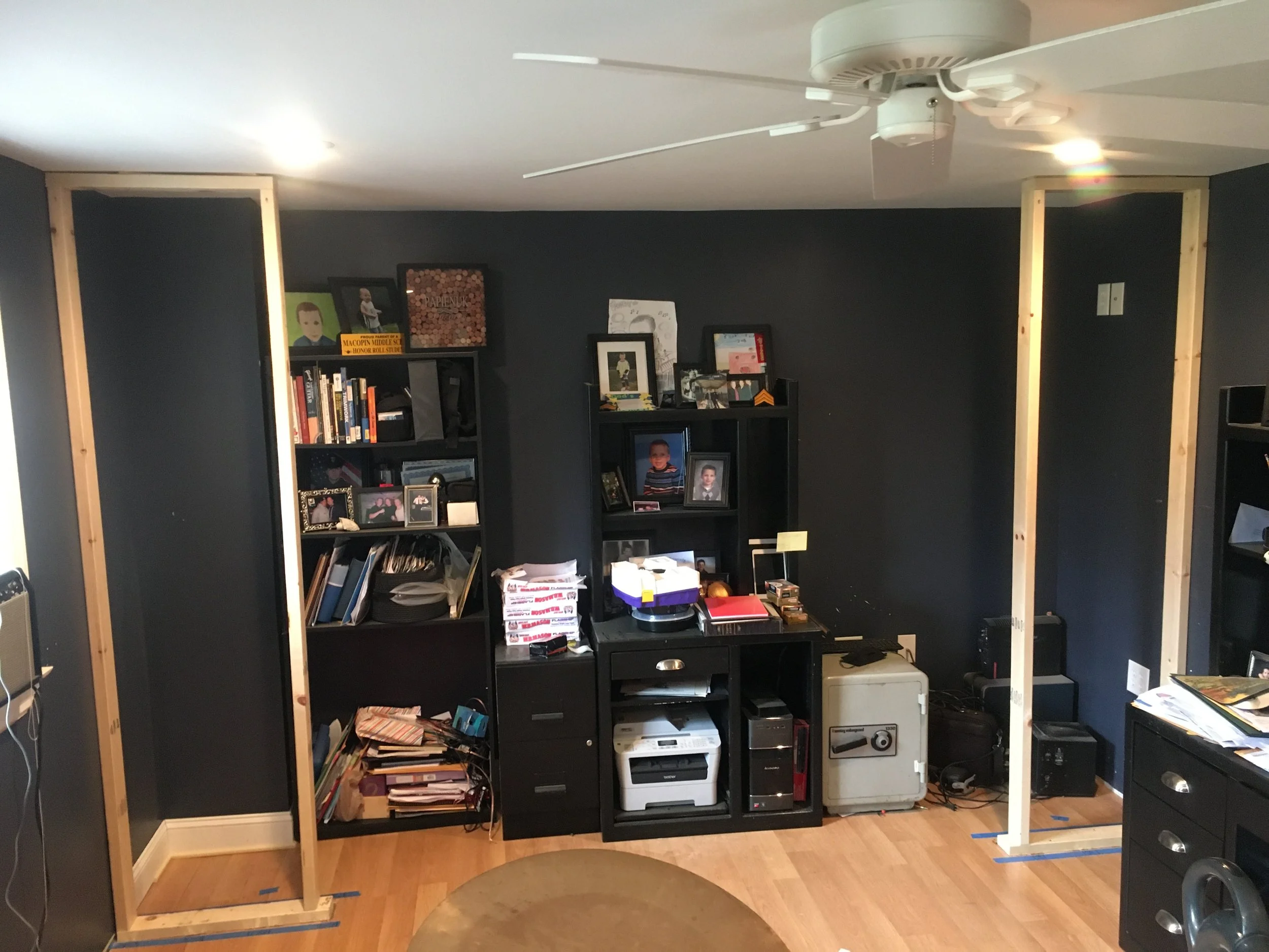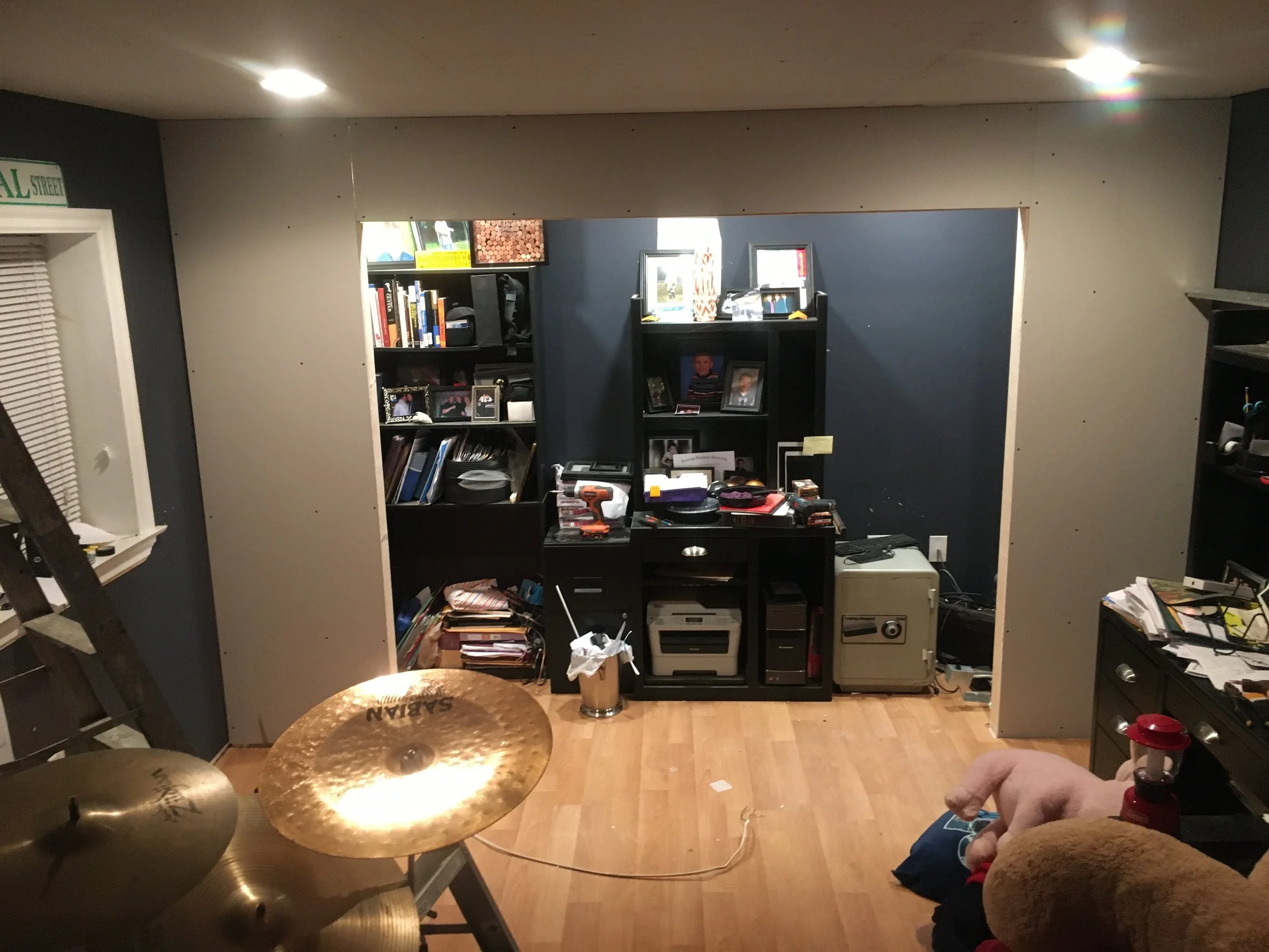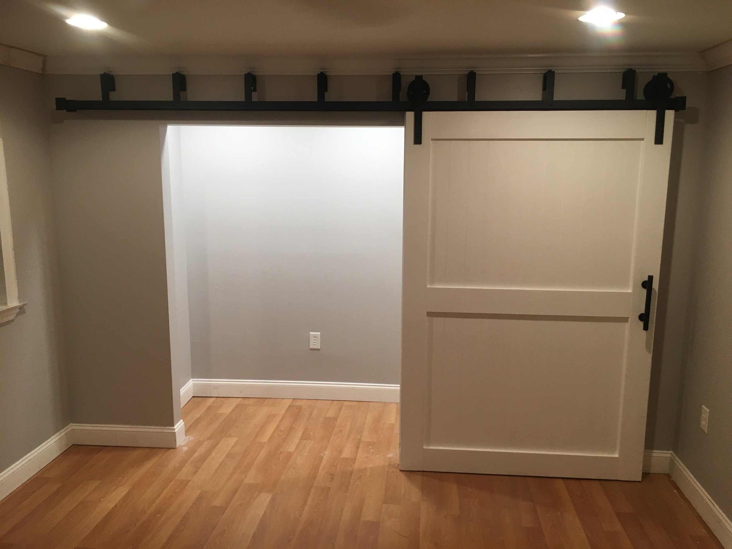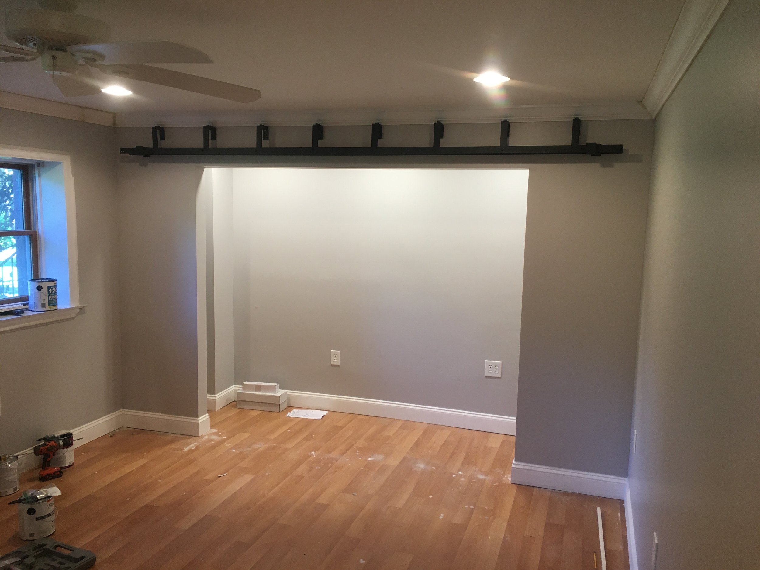 In closet lighting installed. Walls painted, crown and base trim also added. Barn door track was installed.